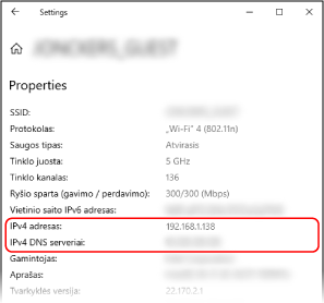 Peržiūrėkite IP adresą, DNS serverį ir kitą informaciją.