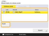 Ja vadības panelī nospiežat  (Pārtraukt), kamēr tiek apstrādāts sūtīšanas/faksa uzdevums, un tiek parādīts ekrāns <Fakss>/<Skenēt un sūtīt>, tiek parādīts uznirstošais logs, kas tiešā veidā atceļ pašreizējo uzdevumu. Ja tiek apstrādāti vairāki uzdevumi, varat noteikt, kurš darbs ir jāatceļ: pēdējais pieprasītais uzdevums vai uzdevums, kas tiek nosūtīts. (<Darbs, kas jāatceļ, nospiežot Apturēt>)