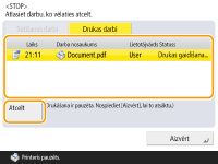Ja vadības panelī nospiežat  (Pārtraukt), kamēr tiek apstrādāts sūtīšanas/drukas uzdevums, un tiek parādīts ekrāns, kuros tiek piedāvātas opcijas <Sūtīšanas darbi>/<Drukas darbi>, pašreizējais sūtīšanas/drukas uzdevums tiek pauzēts, un tiek parādītas opcijas <Sūtīšanas darbi>/<Drukas darbi>.