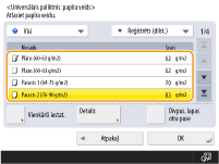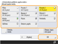 Aploksnes formātu nevar izvēlēties iestatījuma <Papīra veids> detalizētajā ekrānā. Lai izvēlētos aploksnes veidu, reģistrējiet papīra veidu iestatījumā <Reģistrēt izlases papīru (universālajam paliktnim)>, pēc tam 2. darbības ietvaros nospiediet <Izlases papīrs>,