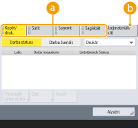 Tiek parādīts izvēlētā vienuma pašreizējais statuss vai žurnāls. Šajā ekrānā varat atcelt kopēšanu, drukāšanu un faksa ziņojumu sūtīšanu.