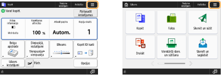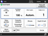 Ekrānā <Sākums> nospiediet funkciju pogas, lai tiktu parādīts pamatfunkciju ekrāns, no kura varat piekļūt pamatfunkcijām, piemēram, kopēšanai, faksa ziņojumu sūtīšanai un skenēšanai. Lai arī pamatfunkciju ekrānā pieejamie displeja un iestatījumu vienumi atšķiras atkarībā no funkcijām, iestatījumus varat mainīt atbilstoši savām vajadzībām. Pamatfunkciju ekrāna pielāgošana
