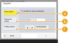 (Iestat./reģistr.) <Preferences> <Tīkls> <Ugunsmūra iestatījumi> <IP adrešu bloķēšanas žurnāls>. Bloķētās komunikācijas vēsturi var eksportēt no attālā interfeisa CSV formātā. Žurnāla ieraksta eksportēšana faila formātāJa <Noklusējuma politika> ir iestatīta uz <Noraidīt>, ugunsmūra bloķētās saziņas vēsture netiek parādīta šeit: <IP adrešu bloķēšanas žurnāls>.