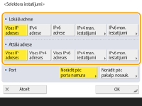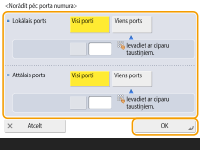 Nospiediet <Norādīt pēc porta numura>, lai izmantotu portu numurus, norādot portus, kuriem piemēro IPSec. Atzīmējiet <Visi porti>, lai piemērotu IPSec visiem portu numuriem. Lai piemērotu IPSec konkrētam porta numuram, nospiediet <Viens ports> un ievadiet porta numuru. Kad porti ir norādīti, nospiediet <OK>. Norādiet šīs iekārtas portu sadaļā <Lokālais ports>, un norādiet sakaru partnera portu <Attālais ports>.