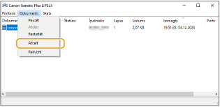 Ja nevarat atrast atceļamo dokumentu, dokuments jau ir nosūtīts uz iekārtu. Šādā gadījumā datorā drukāšanu nevar atcelt.