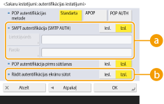 Lai izmantotu SMTP autentifikāciju, nospiediet <Iesl.>, ievadiet norādīto pasta kontu lietotājvārdu un paroli sadaļās <Lietotājvārds> un <Parole>.