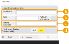 Piemērs: ja Windows domēna nosaukums ir “example” un Windows lietotājvārds ir “user1”, ievadiet “example\user1”. Ja izmantojat Lotus Notes Domino, ievadiet autentificētā lietotāja identifikācijas nosaukumu (dn) šādi: “cn=user1,ou=team1,ou=salesdept,o=canon”.