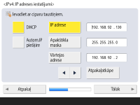 Lai IP adresi iestatītu manuāli, notīriet opcijai <DHCP> vai <Autom.IP piešķire> veikto izvēli, nospiediet <IP adrese>, <Apakštīkla maska> un <Vārtejas adrese>, lai ievadītu katru vērtību, un nospiediet <Tālāk> vai <OK>.