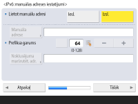 Lai izmantotu manuālo adresi, nospiediet <Manuāla adrese>, <Prefiksa garums> un <Noklusējuma maršrutēt. adr.>, lai ievadītu katru vērtību.