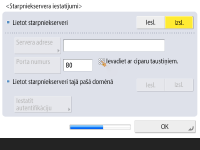 Lai izmantotu starpniekserveri, nospiediet <Iesl.>, nospiediet <Servera adrese> un <Porta numurs>, lai ievadītu katru vērtību, un nospiediet <OK>.