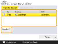 (Stop) drukt terwijl een verzend-/faxopdracht wordt verwerkt en het scherm <Fax>/<Scannen en verzenden> wordt weergegeven, verschijnt een pop-upscherm dat de actieve opdracht direct annuleert. Wanneer meerdere opdrachten worden uitgevoerd, kunt u instellen welke opdracht u wilt annuleren: de laatst gemaakte opdracht of de opdracht die momenteel wordt verzonden. (<Opdrachten ter annulering wanneer op stop is gedrukt>)Als er een opdracht is gestart nadat u op het bedieningspaneel op