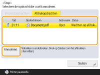 (Stop) drukt terwijl een verzend-/afdrukopdracht wordt verwerkt en een scherm dat leidt naar <Verzendopdrachten>/<Afdrukopdrachten> wordt weergegeven, wordt de actieve verzend-/afdrukopdracht gepauzeerd en verschijnt <Verzendopdrachten>/<Afdrukopdrachten>.