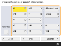 Als <Altijd opgeven> onder <Std.instell. l. papiertafel> wordt ingesteld op <Favoriete papier>, wordt er een scherm weergegeven waarop u uw favoriete papier kunt selecteren wanneer u het papier in de multifunctionele lade plaatst. <Std.instell. l. papiertafel>