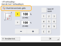 U kunt num. toets. gebruiken.> wordt weergegeven, kunt u numerieke waarden invoeren met de numerieke toetsen op het aanraakscherm.Voorbeeld: <XY-verhouding>-instellingenscherm