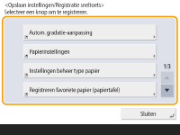 Als <Snelkoppeling Instell./Regist.> niet wordt weergegeven op het scherm <Home>, drukt u op   <Instellingen Home-beheer>  <Functieweergave beperken>  <Instellen>  stel <Snelkoppeling Instell./Regist.> in voor weergaven.