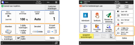 U kunt de instellingenknoppen wijzigen die worden weergegeven op de schermen met basisfuncties (voor kopiëren, faxen en scannen). U kunt ook een ander scherm met basisfuncties weergeven dat is aangepast voor elke aangemelde gebruiker.