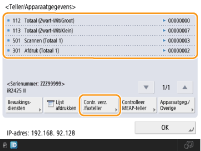 U kunt ook de tellerstandinformatie controleren voor elke MEAP. Druk bij stap 2 op <Controlleer MEAP-teller> op het scherm. Als u in hetzelfde scherm op <Apparaatgeg./Overige>