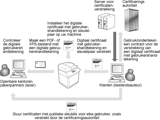 De sleutel en het certificaat (gebruikerscertificaat) die nodig zijn voor het toevoegen van een gebruikershandtekening, kunnen via de Remote UI (UI op afstand) worden geregistreerd. Wijs een beheerder aan die deze items moet registreren. Zodra ze zijn geregistreerd, kunnen gebruikers die zich aanmelden met persoonlijke verificatie, een digitale handtekening toevoegen aan gescande documenten die worden verzonden in een bepaalde bestandsindeling. Een digitale handtekening toevoegen