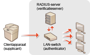 Als een apparaat probeert verbinding te maken en begint te communiceren met het 802.1X-netwerk, moeten de gebruikersgegevens worden geverifieerd om er zeker van te zijn dat de verbinding tot stand wordt gebracht door een bevoegde gebruiker. Hiertoe worden verificatiegegevens verzonden naar en gecontroleerd door een zogenaamde RADIUS-server, die op basis van het verificatieresultaat communicatie met het netwerk toestaat of weigert. Als de verificatie mislukt, wordt de externe toegang tot het netwerk geblokkeerd door een LAN-switch (of een toegangspunt). Het apparaat kan als een clientapparaat worden aangesloten op een 802.1X-netwerk.