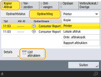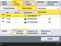 Als u op (Statusmonitor) drukt, wordt het scherm Statusmonitor weergegeven, waarin u de gebruiksgeschiedenis voor elke functie kunt controleren, zoals kopiëren, afdrukken, e-mail verzenden, faxen/I-faxen verzenden/ontvangen, enz. Vanaf dit scherm kunt u ook de gebruiksgeschiedenis voor elke functie afdrukken.