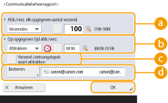 U kunt de machine zo configureren dat het rapport automatisch wordt afgedrukt of als een CSV-bestand naar bestemmingen die in het adresboek zijn opgeslagen, wordt verzonden wanneer een bepaald aantal communicatieresultaten, inclusief verzonden of ontvangen faxen, e-mails en I-faxen, evenals items die op de bestandsserver zijn opgeslagen, is bereikt. U kunt de machine ook zo configureren dat het rapport op een bepaald tijdstip wordt afgedrukt of als een CSV-bestand wordt verzonden.