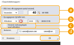 U kunt de machine zo configureren dat een rapport automatisch wordt afgedrukt bij het verzenden of ontvangen van een fax of dat het rapport als een CSV-bestand wordt verzonden naar bestemmingen die in het adresboek zijn opgeslagen wanneer het opgegeven aantal verzonden of ontvangen faxen is bereikt. U kunt de machine ook zo configureren dat het rapport op een bepaald tijdstip wordt afgedrukt of als een CSV-bestand wordt verzonden.