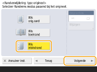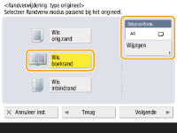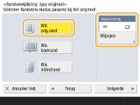 Als het formaat bij <Origineelform.> afwijkt van het formaat van het boek, druk dan op <Wijzigen> om het formaat te selecteren. Alleen de origineelformaten op het aanraakscherm kunnen worden gescand.