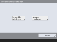 Lijst met items die kunnen worden gepersonaliseerd). Als u <Apparaatinstellingen> selecteert, worden de instellingen geregistreerd als de instellingen van de machine. Als u zich aanmeldt als gebruiker zonder beheerdersbevoegdheden, net zoals wanneer u <Persoonlijke instellingen> selecteert, en als u instellingen wijzigt die kunnen worden gepersonaliseerd, worden instellingen geregistreerd als persoonlijke instellingen zonder te worden geregistreerd als apparaatinstellingen.