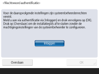 Druk op <Inloggen> en voer de gebruikersnaam en het wachtwoord in van een beheerder met beheerdersbevoegdheden. De standaardgebruikersnaam voor de beheerder is "Administrator" en het standaardwachtwoord is "7654321". Druk opnieuw op <Inloggen> en dan op <OK>.