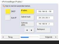 Als u het IP-adres handmatig wilt instellen, wist u de selectie voor <DHCP> of <Auto IP>, drukt u op <IP-adres>, <Subnet mask> en <Gateway adres> om elke waarde in te voeren en drukt u op <Volgende> of <OK>.
