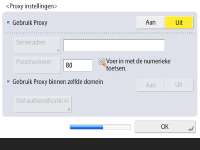 Om de proxy te gebruiken, drukt u op <Aan>, <Serveradres> en <Poortnummer> om elke waarde in te voeren, en dan op <OK>.