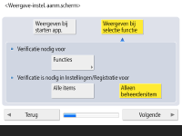 Druk op <Aan> voor <Gebruik gebruikersveri.>, druk op <Aan> voor de aanmeldingsmethode en dan op <Volgende>.