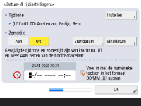Stel zo nodig <Tijdzone> en <Zomertijd> in. Voor meer informatie raadpleegt u De datum/tijd instellen.