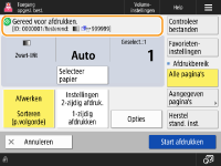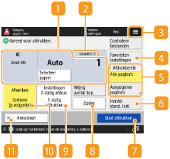 Geeft instellingenstatus weer, zoals het papierformaat om op af te drukken en het aantal afdrukken. Controleer de instellingen om goed te kunnen afdrukken. Om de instellingen te wijzigen, drukt u op de knop onder het weergavegedeelte. Om het aantal afdrukken te wijzigen, voert u met de numerieke toetsen het aantal in.
