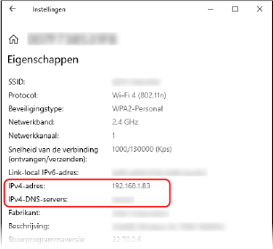 In [Eigenschappen] bekijkt u IP-adres en DNS-server.
