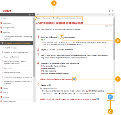Klikk for å vise informasjon om hvordan du viser Bruksanvisning, hvordan du søker og annen informasjon.