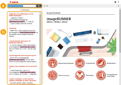for å vise søkeskjermen. Inneholder en tekstboks hvor du kan søke ved bruk av nøkkelord og finne den siden du ser etter.