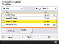 Hvis papirtypen som er lagt inn, ikke vises, trykker du på <Detaljert innst.> for å velge fra en liste.