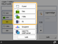 Det er praktisk å registrere en ofte brukt destinasjon i en ettrykksknapp. Dette lar deg raskt spesifisere en destinasjon med ett enkelt trykk på en knapp. I tillegg til å registrere et faksnummer eller en e-postadresse i en ettrykksknapp, kan du også registrere en filservermappeplass (IP-adresse og bane) som skal brukes når du lagrer skannede data.