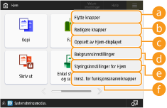 Avhengig av innstillingene for <Tillat tilpasning av Hjem-display for felles bruk> og rettighetene til den innloggede brukeren, kan det vises et skjermbilde for å velge enten <Tilpass for personlig bruk> eller <Tilpass for felles bruk> når <Flytte knapper>, <Redigere knapper>, <Oppsett av Hjem-displayet> eller <Bakgrunnsinnstillinger> er valgt.