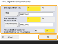 Trykk på <Innst. for personl. SSID og nettv.nøkkel>, spesifiser en personlig SSID og nettverksnøkkel og trykk på <OK>.