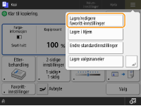 Hvis du bruker de samme innstillingene hver gang for kopiering, faks eller skanning eller vil lagre kompliserte innstillinger, kan du registrere innstillinger som favorittinnstillinger, som senere kan hentes.