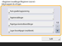 Hvis <Snarvei for innst./lagring> ikke vises på <Hjem>-skjermbildet, trykker du på   <Styringsinnstillinger for Hjem>  <Begrens funksjonsvisning>  <Innstille>  angitt <Snarvei for innst./lagring> til å vises.