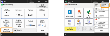 Hvis du ofte bruker den samme kombinasjonen av innstillinger for kopiering, faks og skanning, er det praktisk at du har disse innstillingene registrert som <Favorittinnst.>.