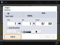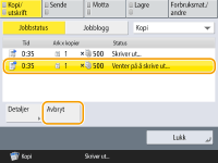 (Stopp) på kontrollpanelet mens grunnleggende funksjoner for kopi-skjermen vises, blir kopieringsjobben satt på pause og meldingen <StoppVelg kopijobben du vil avbryte.> og listen over kopieringsjobber vises. Du kan velge kopieringsjobben fra listen og avbryte jobben ved å trykke på <Avbryt>.Hvis du logger inn med personlig autentiseringsadministrasjon og logger ut etter å ha trykket på