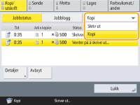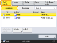 (Stopp) på kontrollpanelet når kopieringsjobber venter, blir alle kopieringsjobbene satt på pause, og deretter vises meldingen <StoppVelg kopijobben du vil avbryte.> og listen over kopieringsjobber. Du kan velge en kopieringsjobb fra listen og avbryte den ved å trykke på <Avbryt>. Hvis du vil fortsette kopieringen, trykker du på <Forts. kopiering>. |
