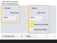 Hvis du vil flytte bildet på baksiden når du kopierer begge sider, er innstillingen <Bakside> nødvendig. Hvis du vil flytte det til samme posisjon som forsiden, trykker du på <Samme som forside>. Hvis du vil flytte det symmetrisk, trykker du på <Motsatt av forside>. Hvis du vil flytte det til en annen posisjon enn på forsiden, trykker du på <Innstille> og angir flyttingsavstanden.
