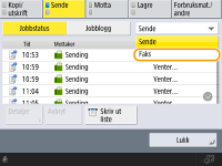 (Stopp) når det er flere sendejobber for å vise skjermbildet for å velge sendejobben du vil avbryte. Hvis sendejobben du ønsker å avbryte ikke vises, trykker du på <Sjekk andre jobber> for å vise <Send jobber>. Velg jobben som du vil avbryte og trykk på <Avbryt>. |