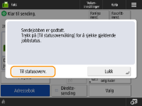 Når <Vis varsel når jobb godtas> angis til <Ja>, kan skjermbildet <Statusoverv.> vises fra det følgende skjermbildet som vises etter en sendejobb er mottatt. <Vis varsel når jobb godtas>