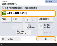 Sende fakser til utlandetTast inn det internasjonale tilgangsnummeret, landskoden og faksnummeret – i den rekkefølgen. Hvis du ikke kan koble til mottakeren i utlandet, må du trykke på <Pause> for å legge inn en pause mellom et nummer og tekstnummeret.